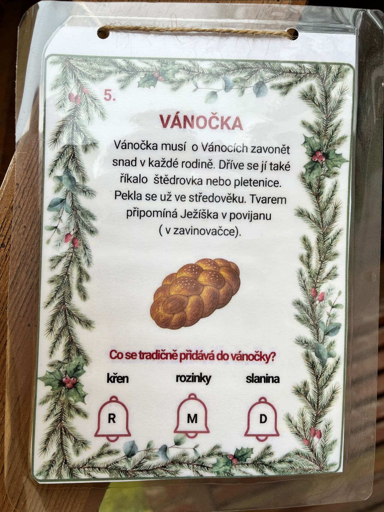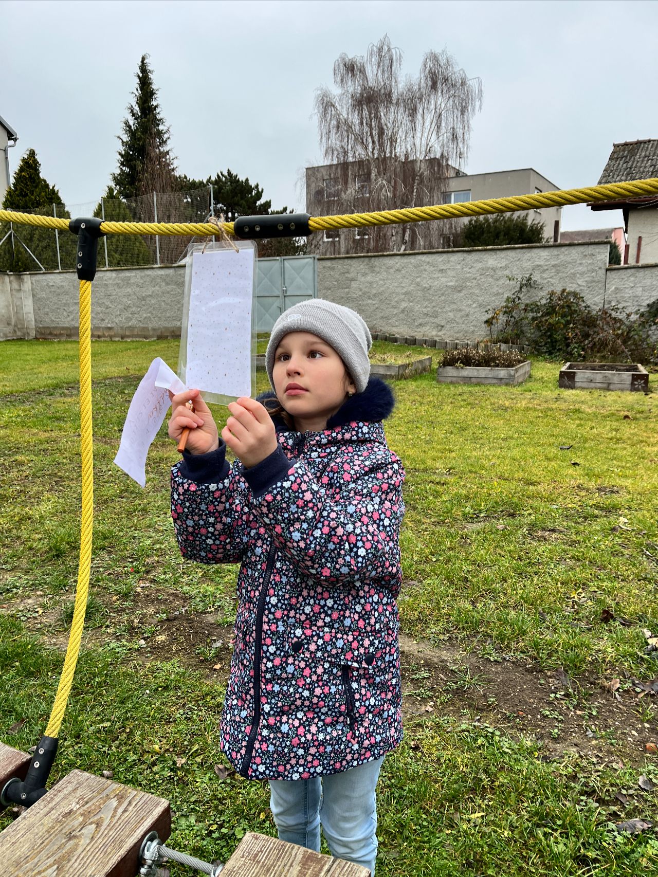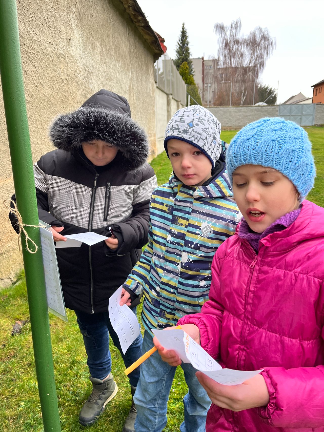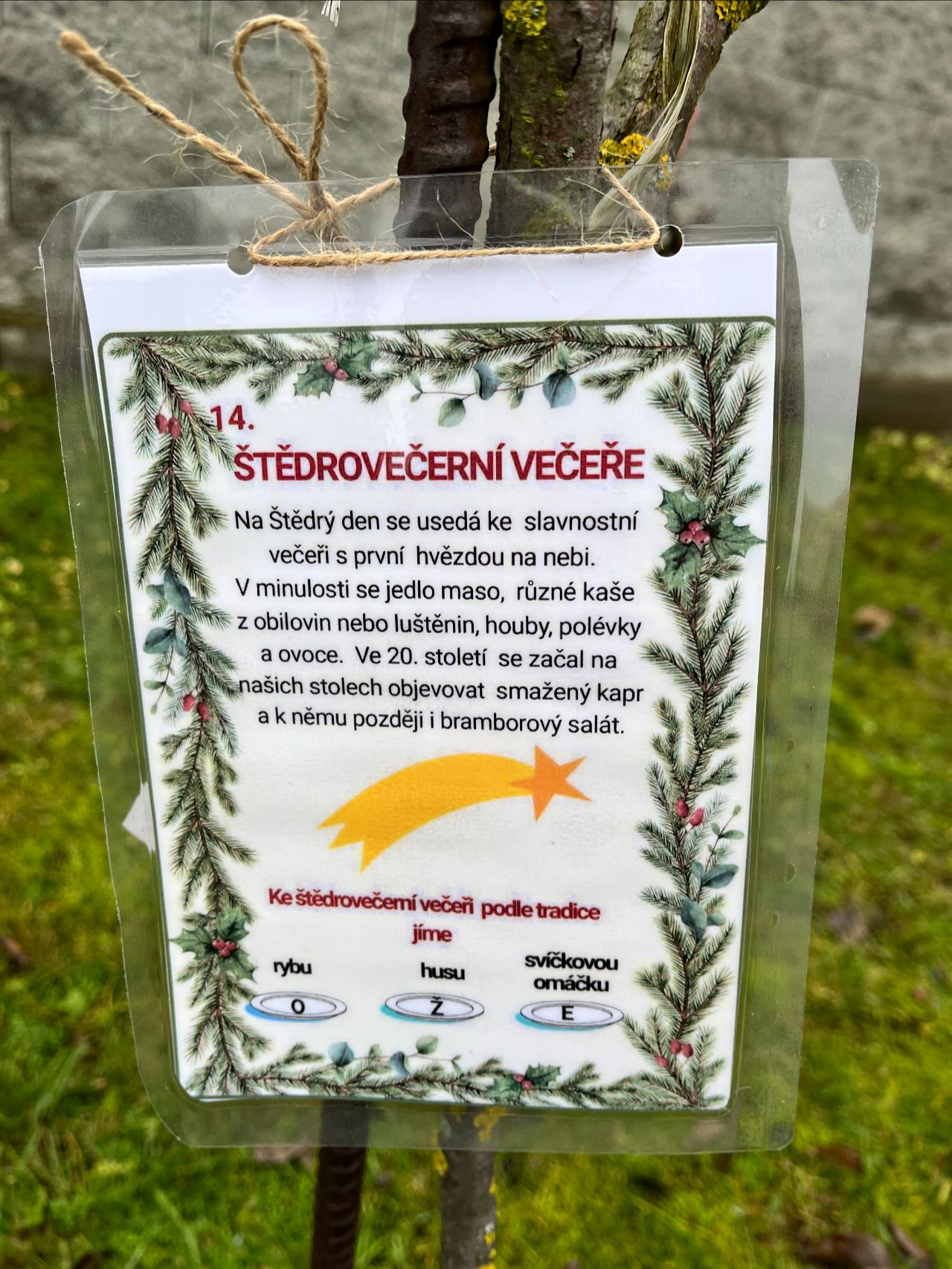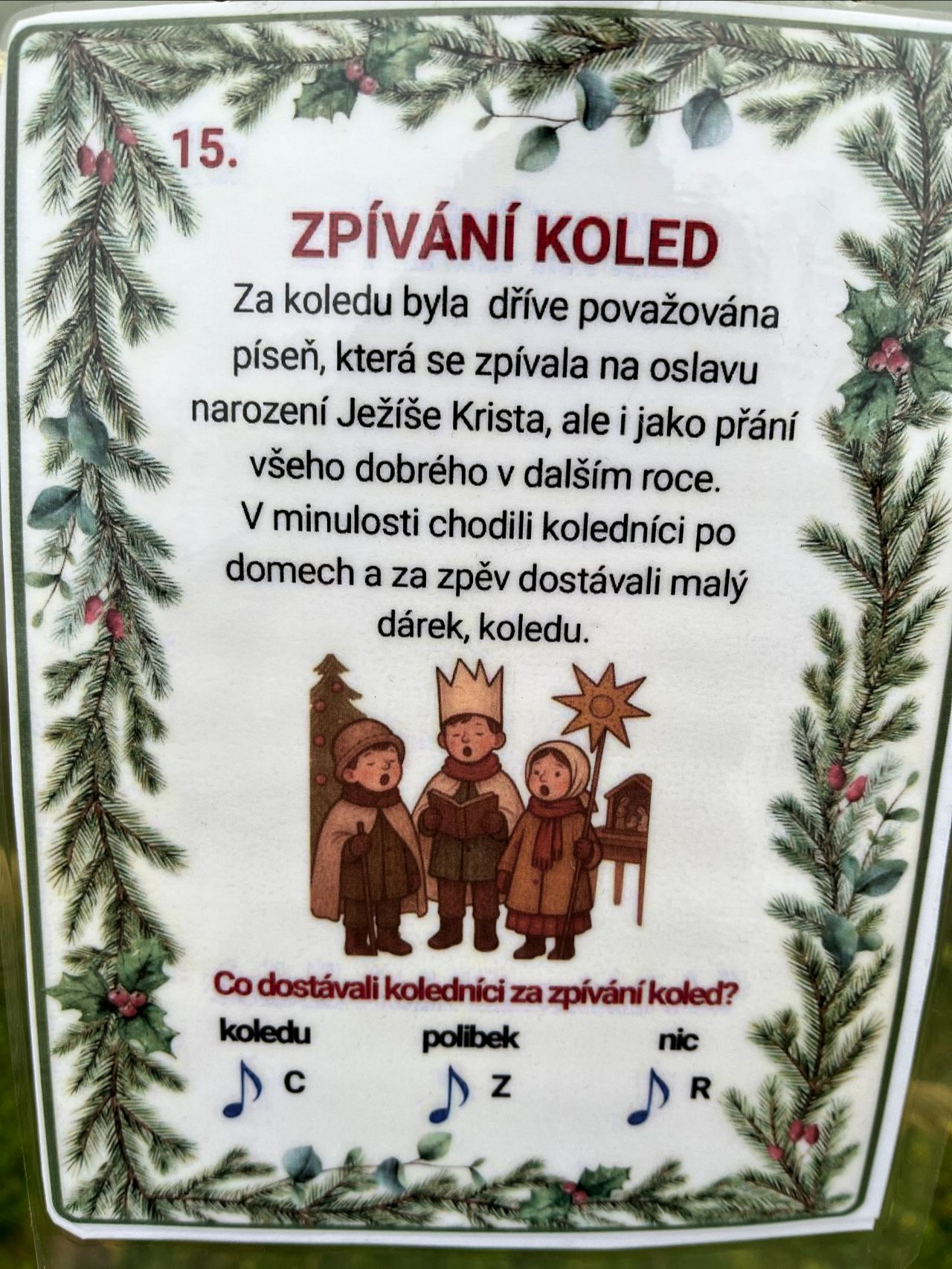 Poté se děti vydaly na školní zahradu, kde na ně čekalo 16 otázek, na které, když správně odpovědely, vyšla jim tajenka Těšíme se na Vánoce. Mezi otázkami bylo např. Co je tradičně na štědrovečerní večeři? Co dostávali koledníci za zpívání koled? nebo Odkud pochází zvyk zdobení vánočního stromku?