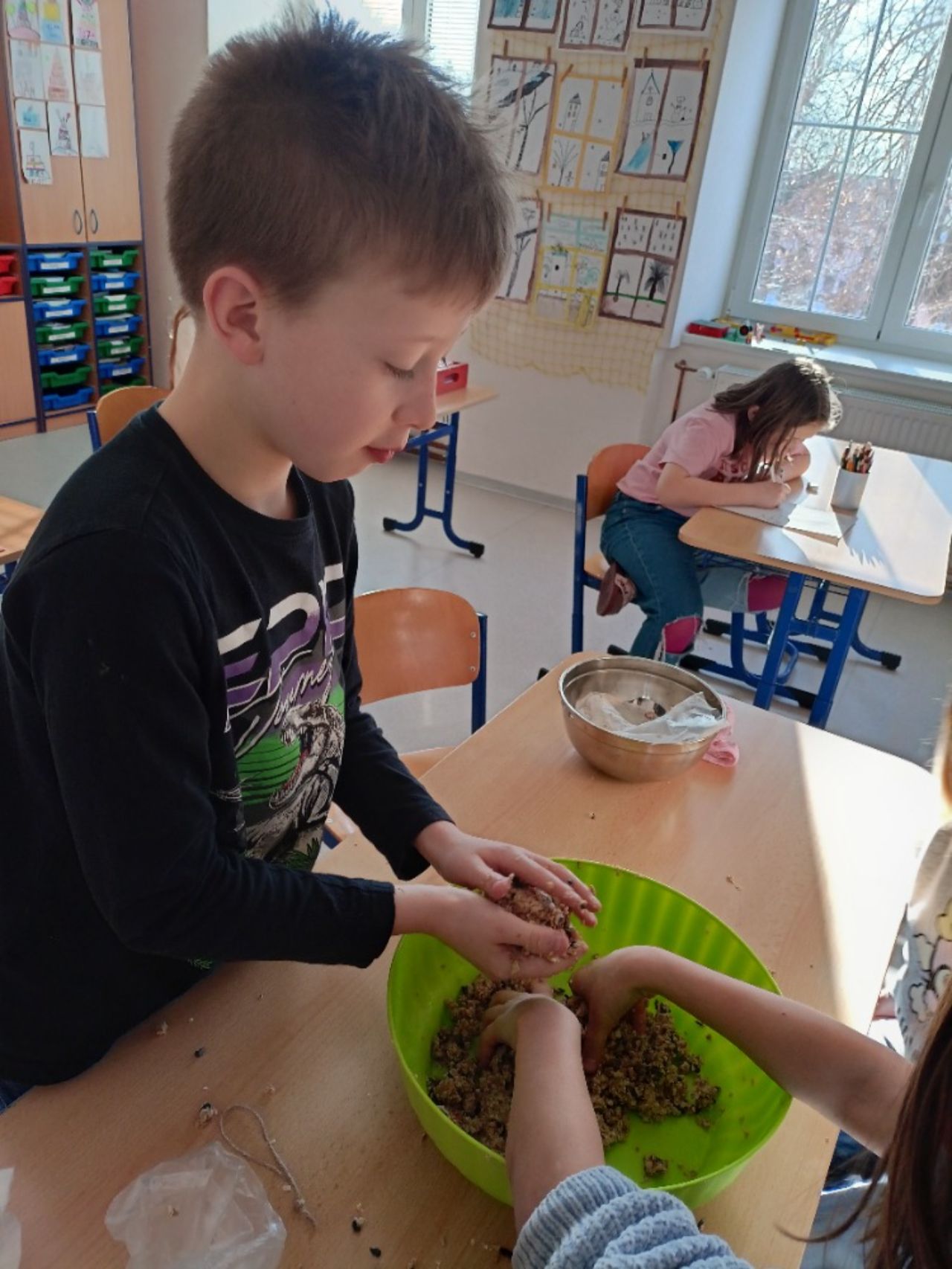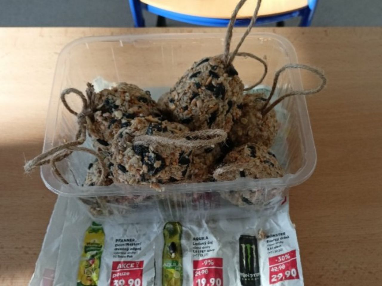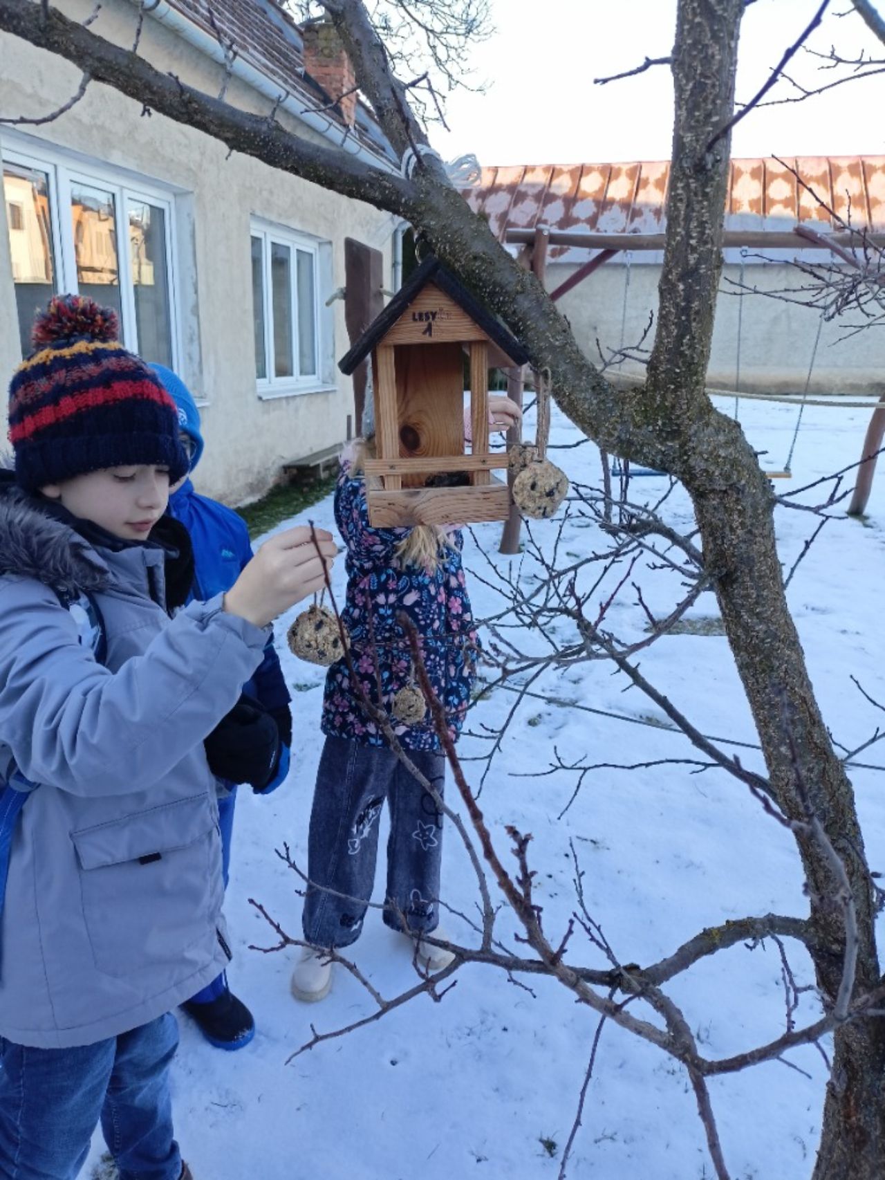 Ve středu 21. 1. 2026 si vzpomněly na ptáčky, kteří mají v zimním počasí málo potravy a vyrobily pro ně lojové koule. Ty potom pověsily na stromky na školní zahradě.