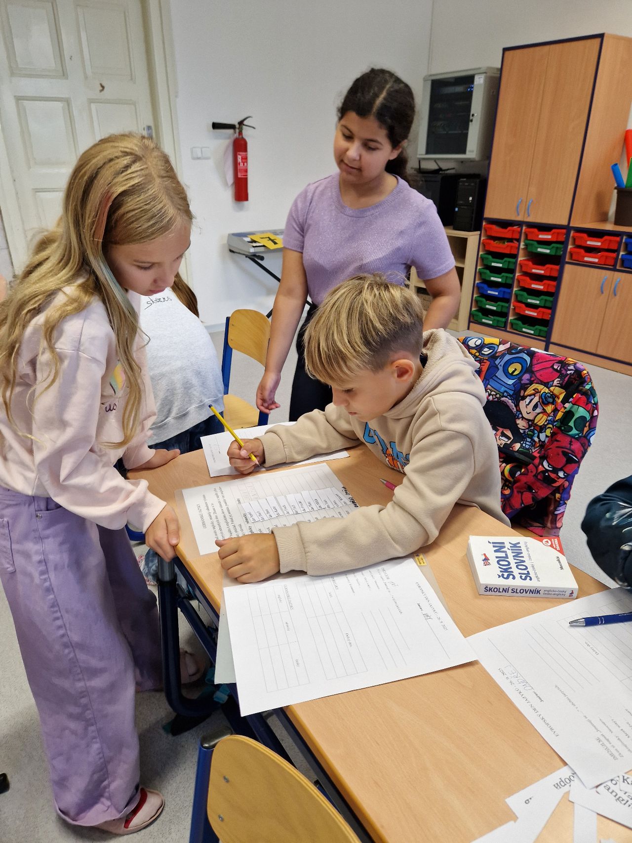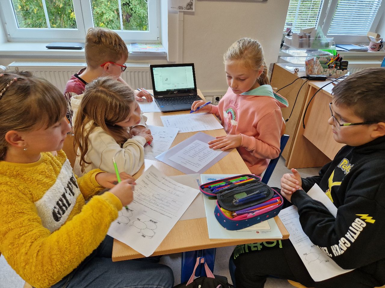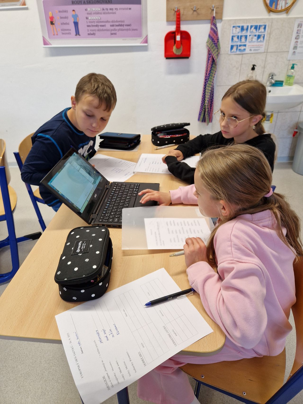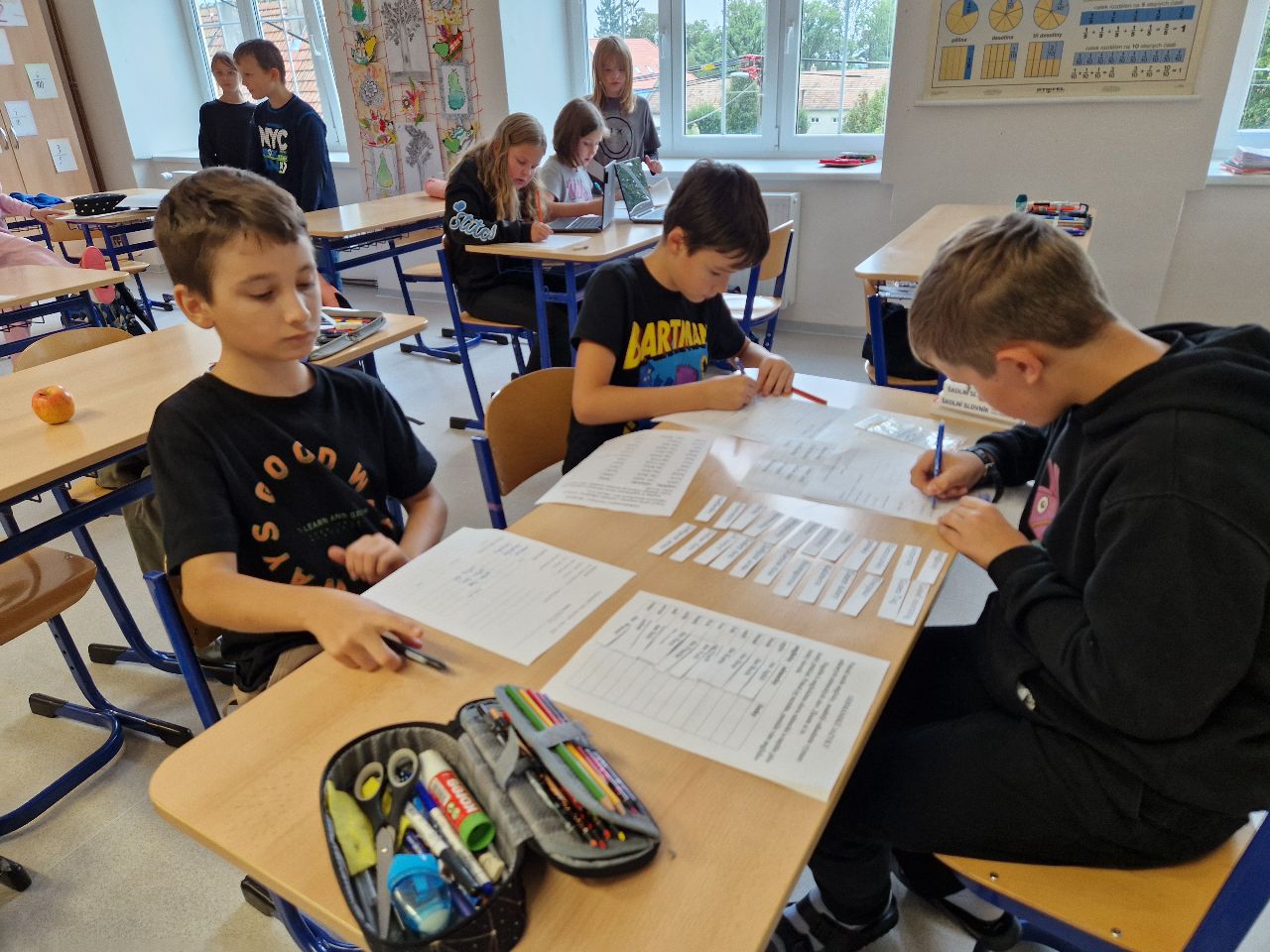 Poté ve skupinkách plnili úkoly. Po vyřešení si vždy podle klíče sami zkontrolovali a zapsali do svého pracovního listu. U některých úkolů využívali notebooky nebo slovníky.