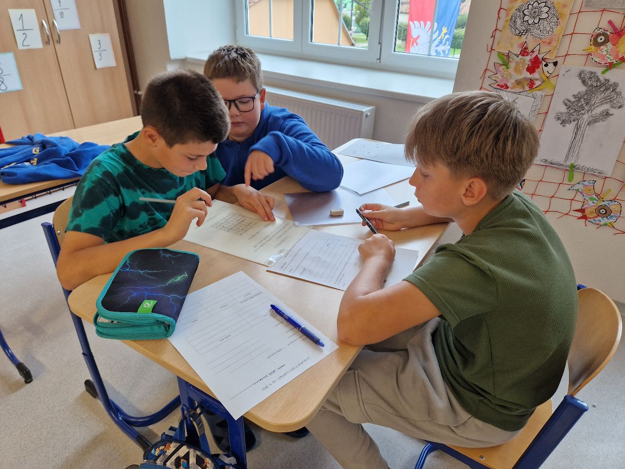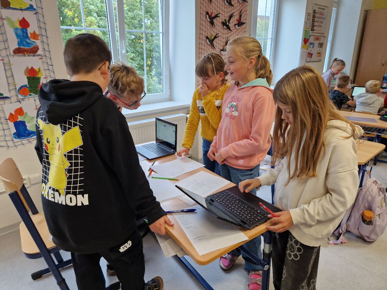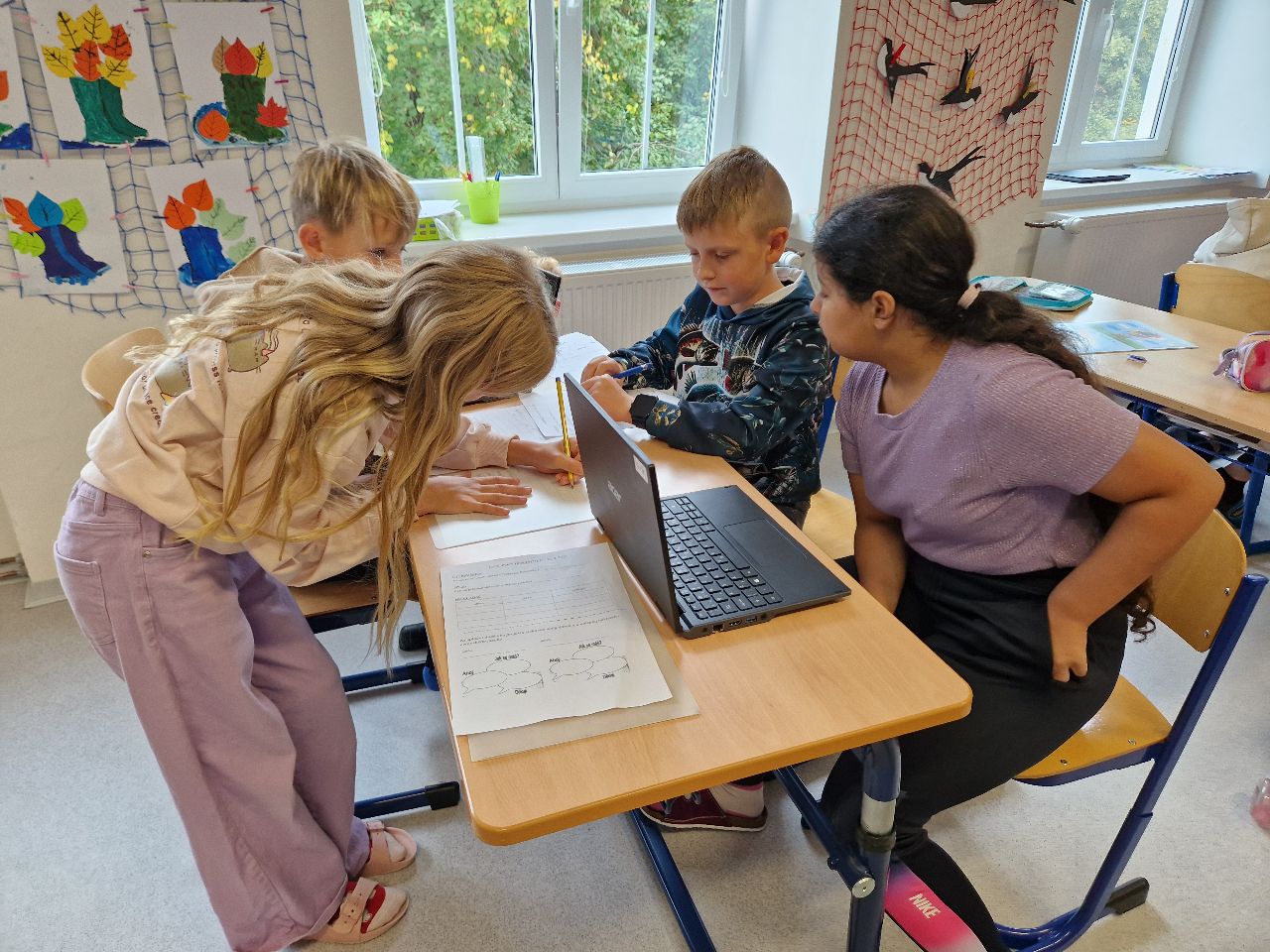 Poté ve skupinkách plnili úkoly. Po vyřešení si vždy podle klíče sami zkontrolovali a zapsali do svého pracovního listu. U některých úkolů využívali notebooky nebo slovníky.
