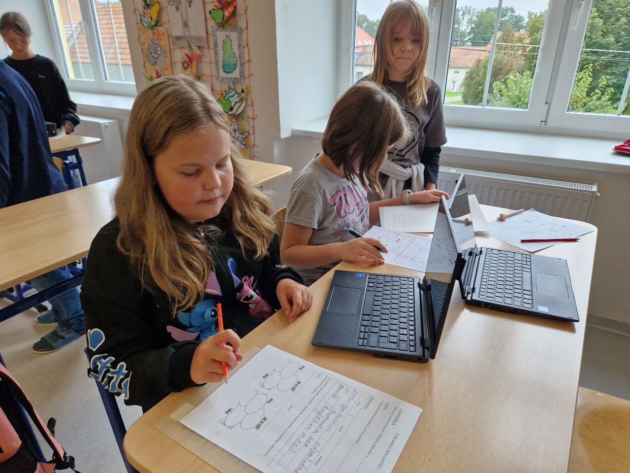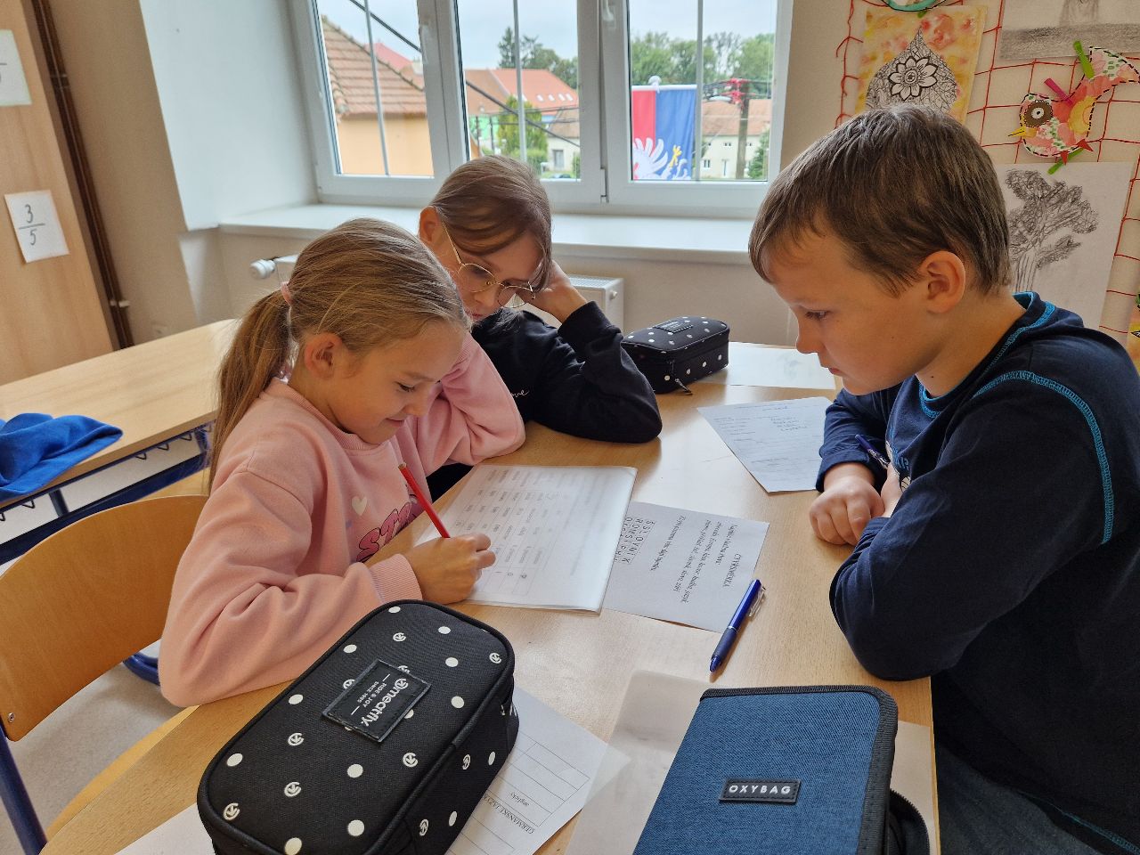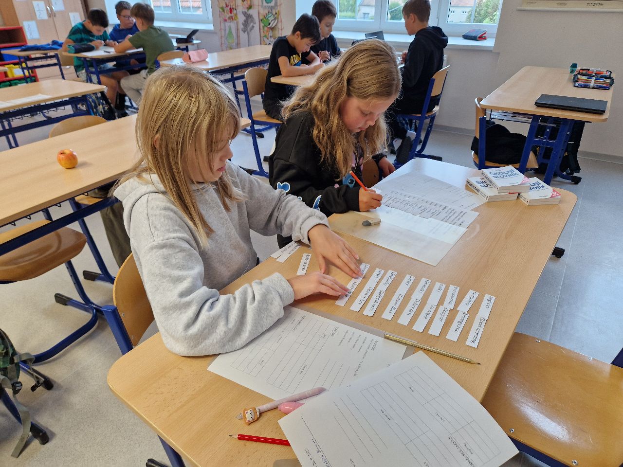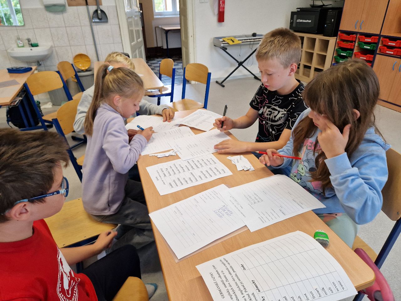 Poté ve skupinkách plnili úkoly. Po vyřešení si vždy podle klíče sami zkontrolovali a zapsali do svého pracovního listu. U některých úkolů využívali notebooky nebo slovníky.