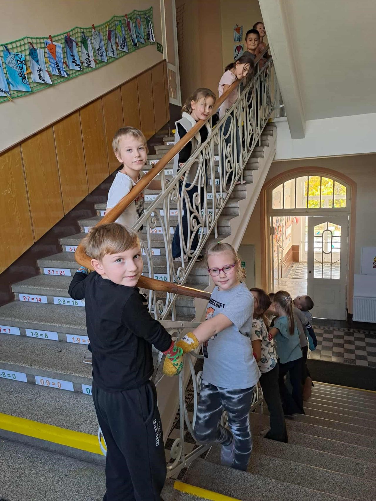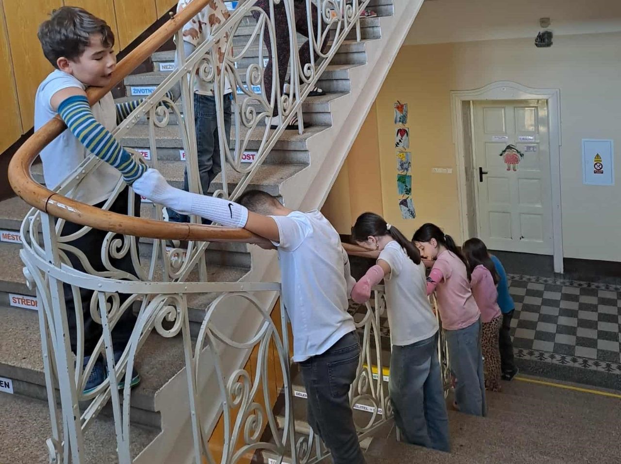 Druháci vytvořili ponožkového hada, když si oblékli čisté ponožky na ruce a chytili se. Jejich had se vinul z 2. patra až do přízemí ke dveřím na školní zahradu.
