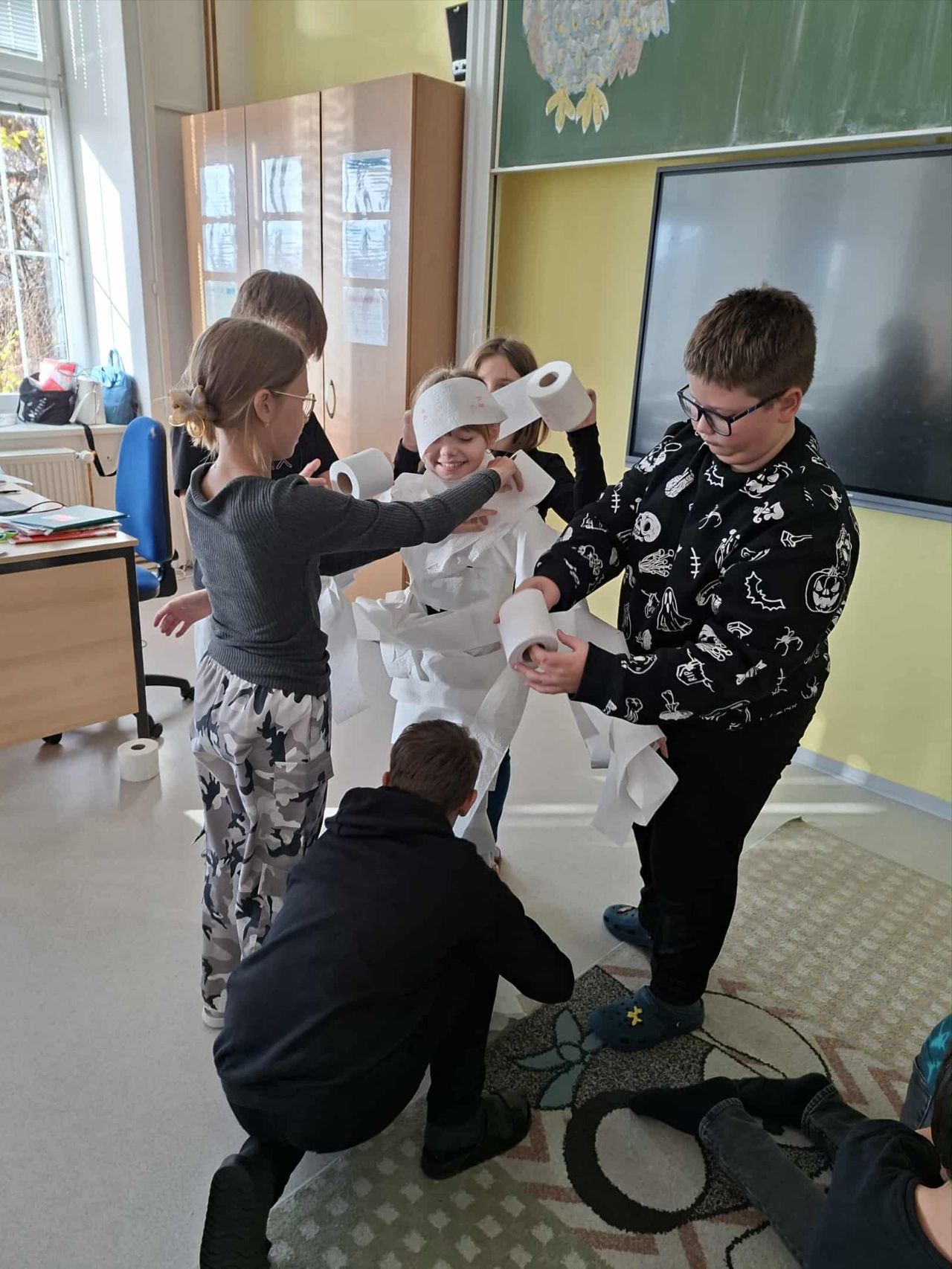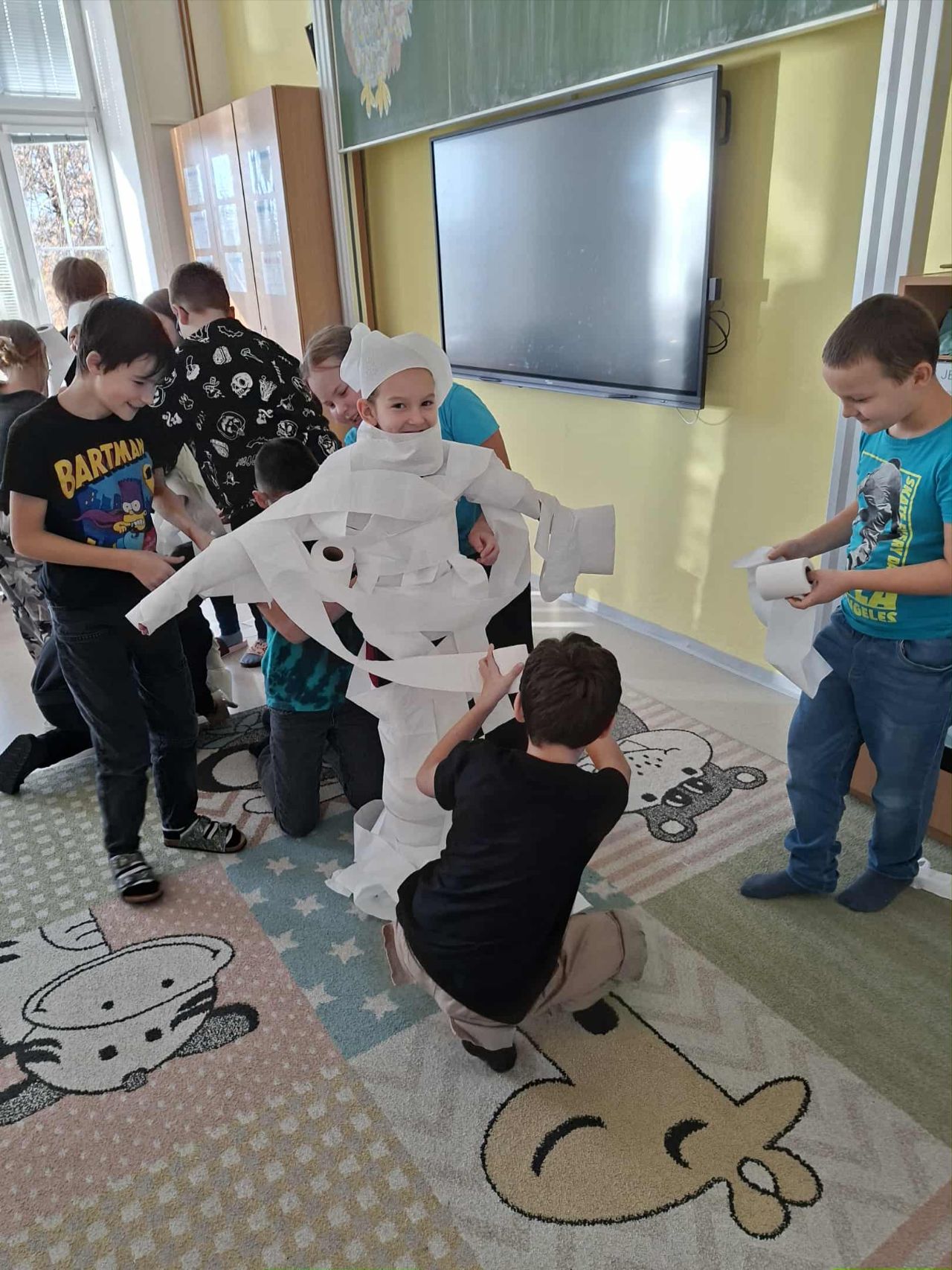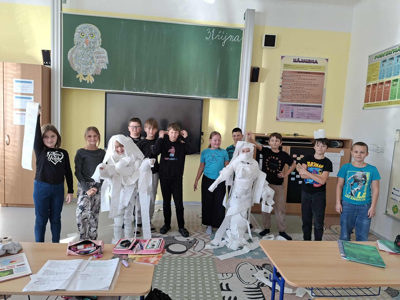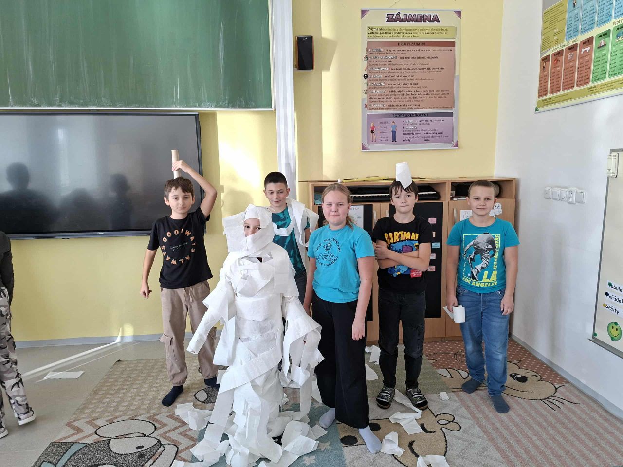 V páté třídě vyzvořili 2 družstva a soutěžili, které bude rychlejší v omotávání spolužáka toaletním papírem. Vítězové na vytvoření "Halloweenské mumie" potřebovali pouze 3 min 49 s.