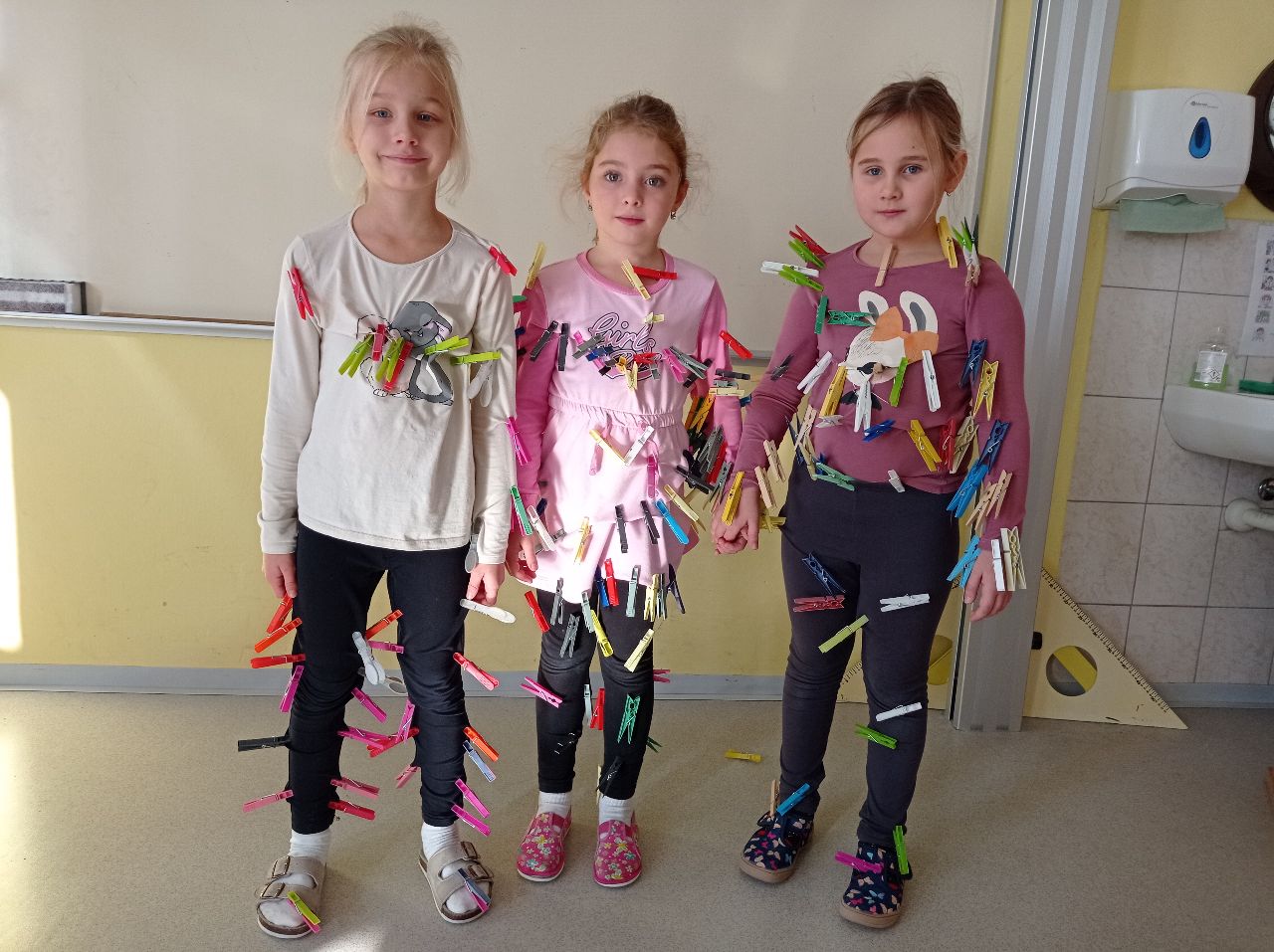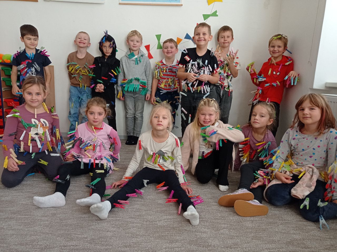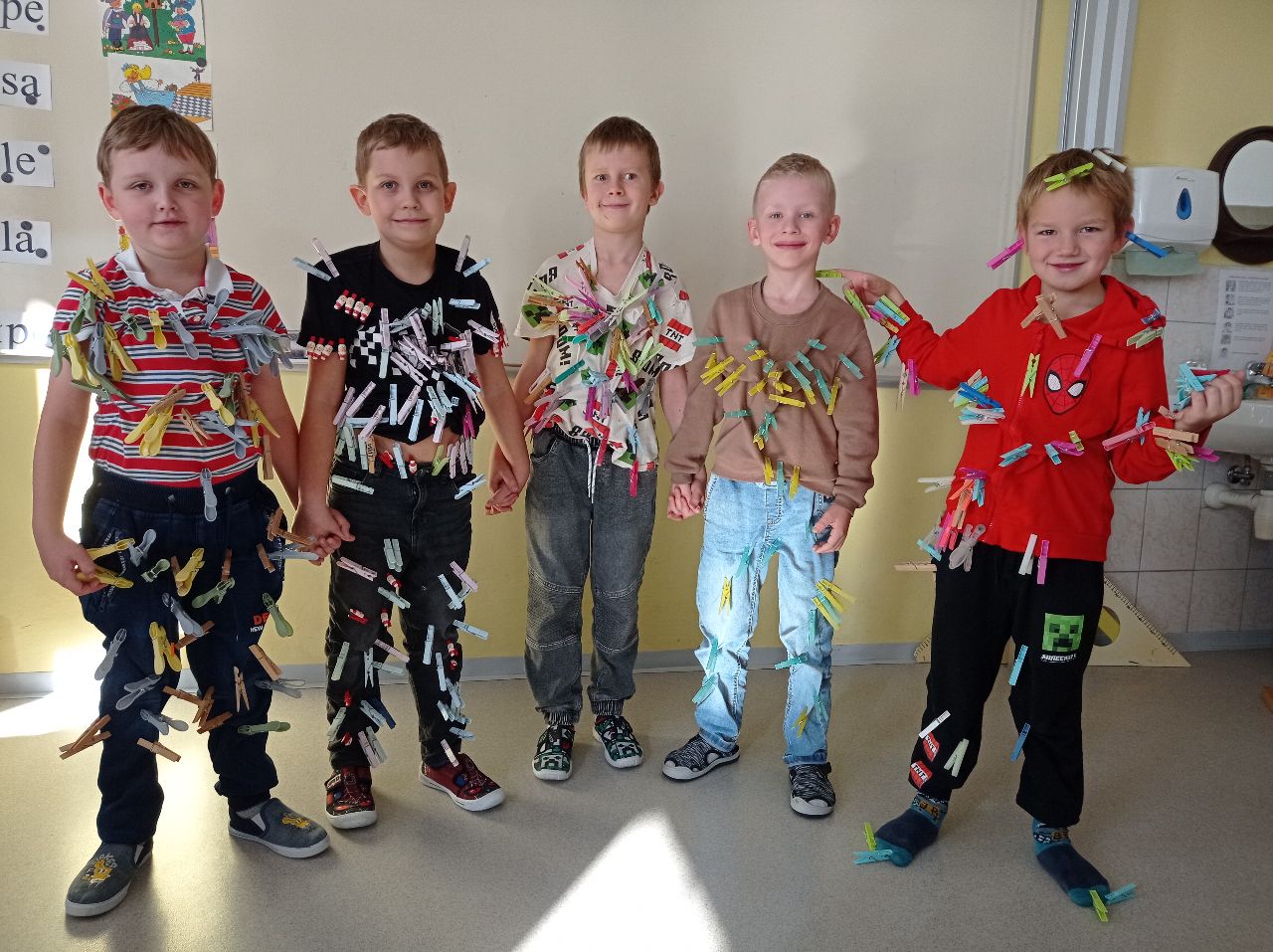 Prvňáci dostali za úkol donést kolíčky na prádlo, kterými se potom ozdobili. Nejvíce kolíčků, které donesl jeden žák, bylo 124. Celkem se prvňáci ozdobili 812 kolíčky.