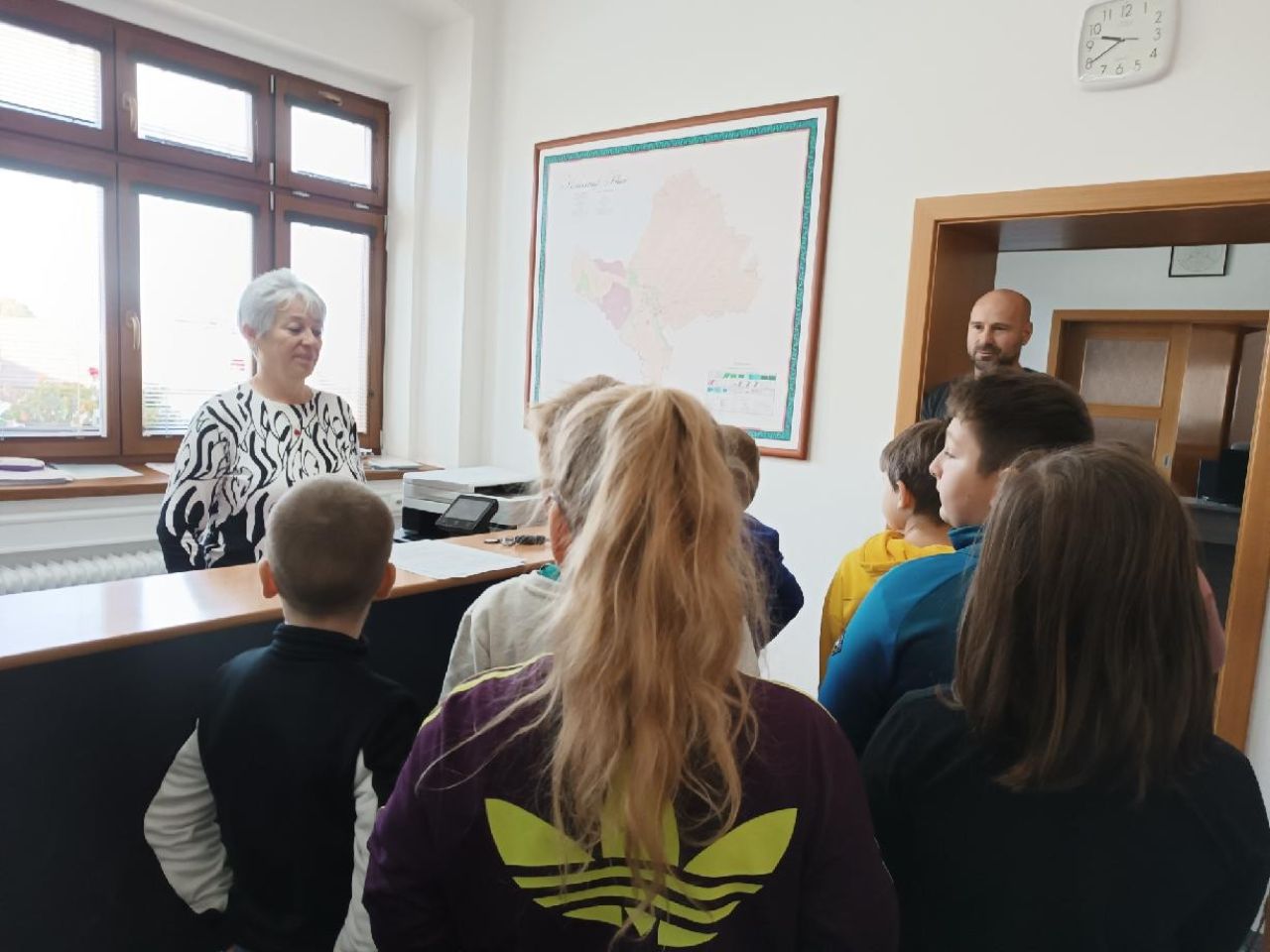 Po besedě pan Labonek děti provedl po obecním úřadě. Ukázal jim i svoji pracovnu. Nejvíc zaujal sál, v němž se konávají slavnostní události, např. vítání občánků a svatby.