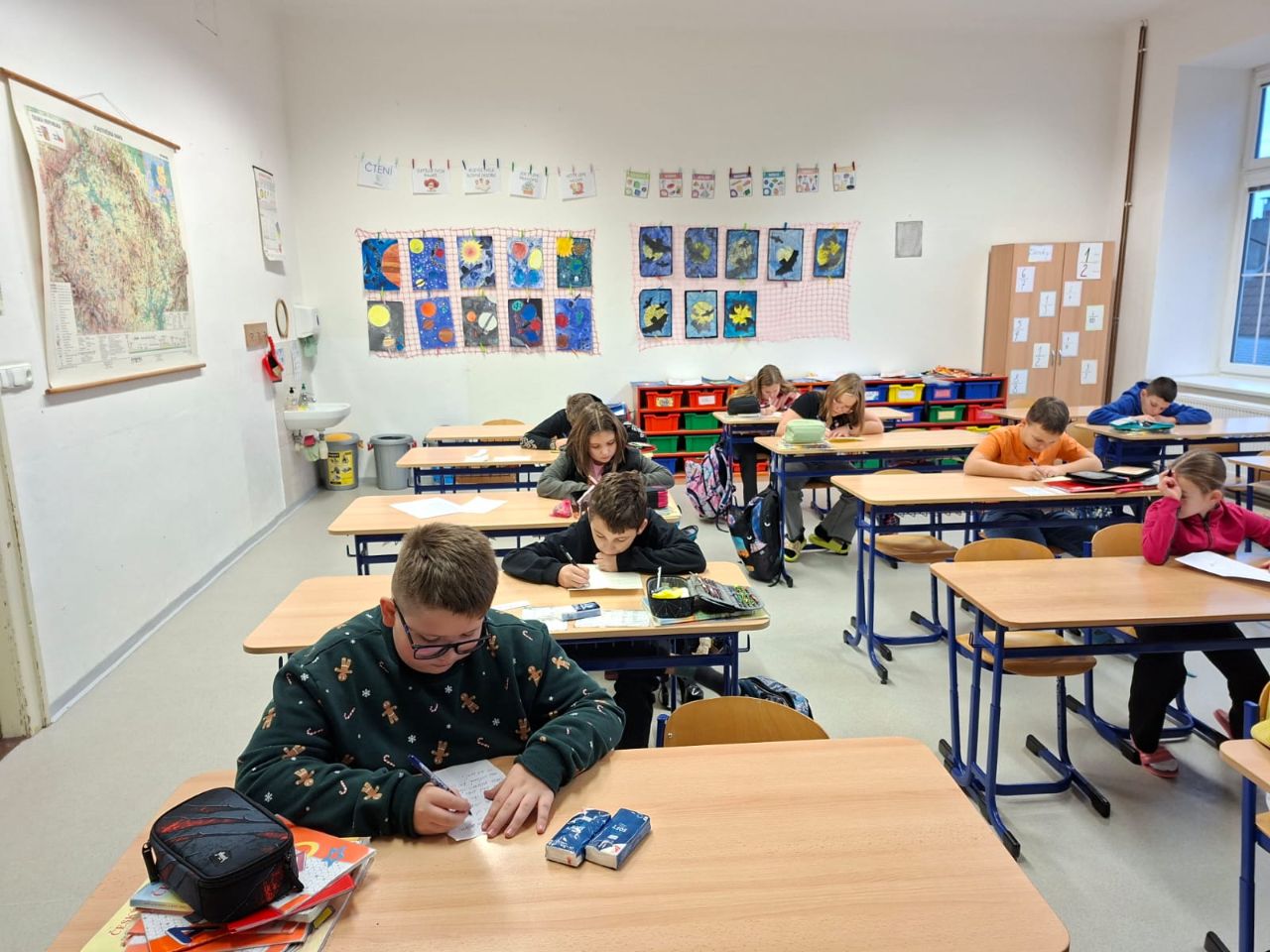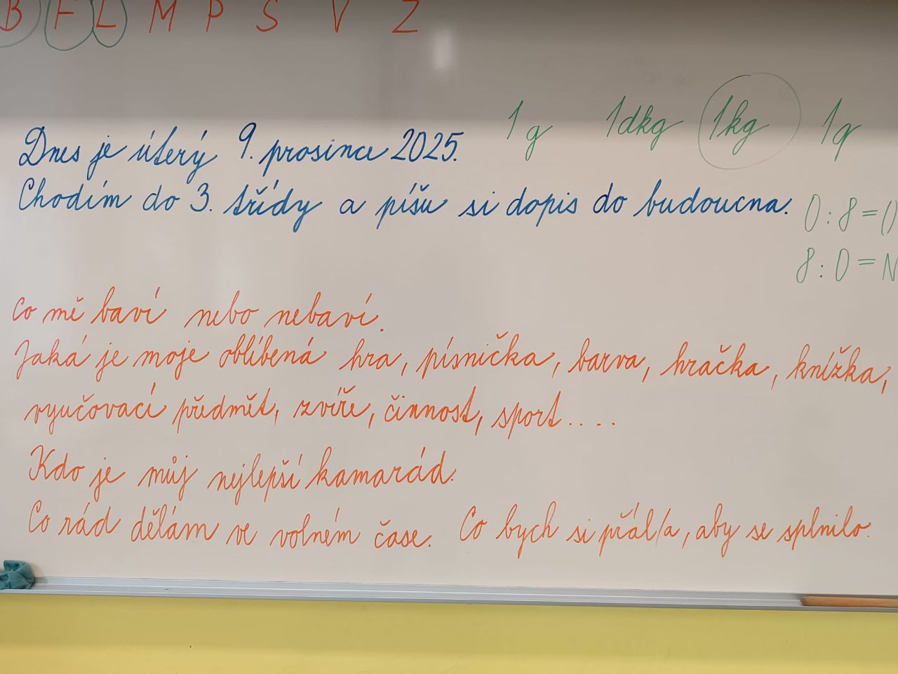 Pro prvňáky to byla opravdová výzva, protože toho napsat ještě moc neumí. Jejich dopis obsahoval odpovědi na nejrůznější otázky, například: Co tě ve škole baví? nebo Ve kterém předmětu by ses chtěl zlepšit? Někteří žáci psali tiskacími písmeny, ostatní své odpovědi nakreslili.