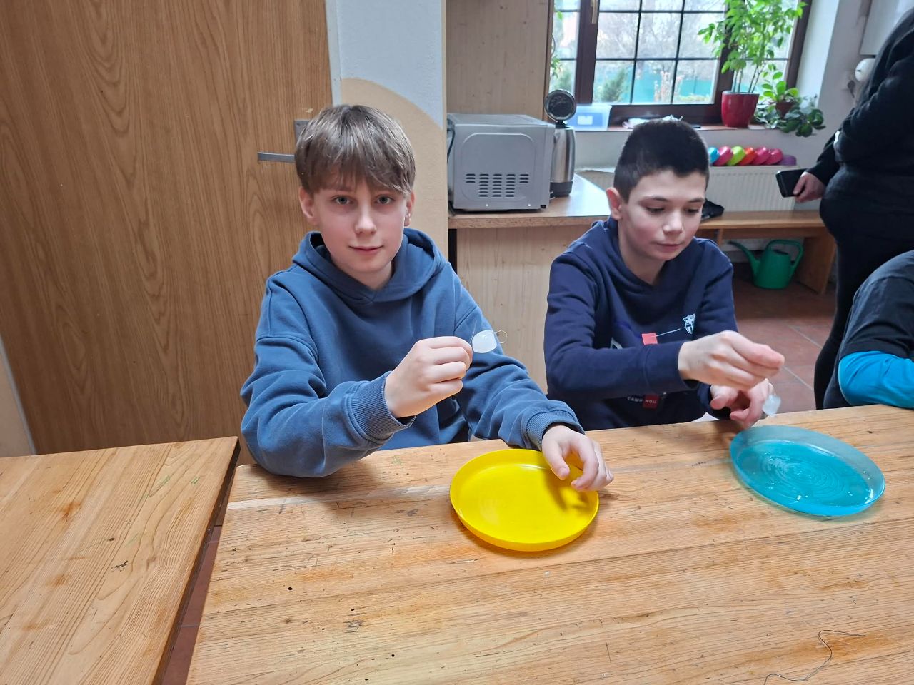 Ve druhé části na ně čekaly různé pokusy. Pracovali s vodou v pevném i kapalném skupenství. Žáci se dozvěděli, co je to chromatografie a vyzkoušeli si, jak probíhá daný rozklad barev. Dále zkoumali, jak ve vodě působí povrchové napětí a další.